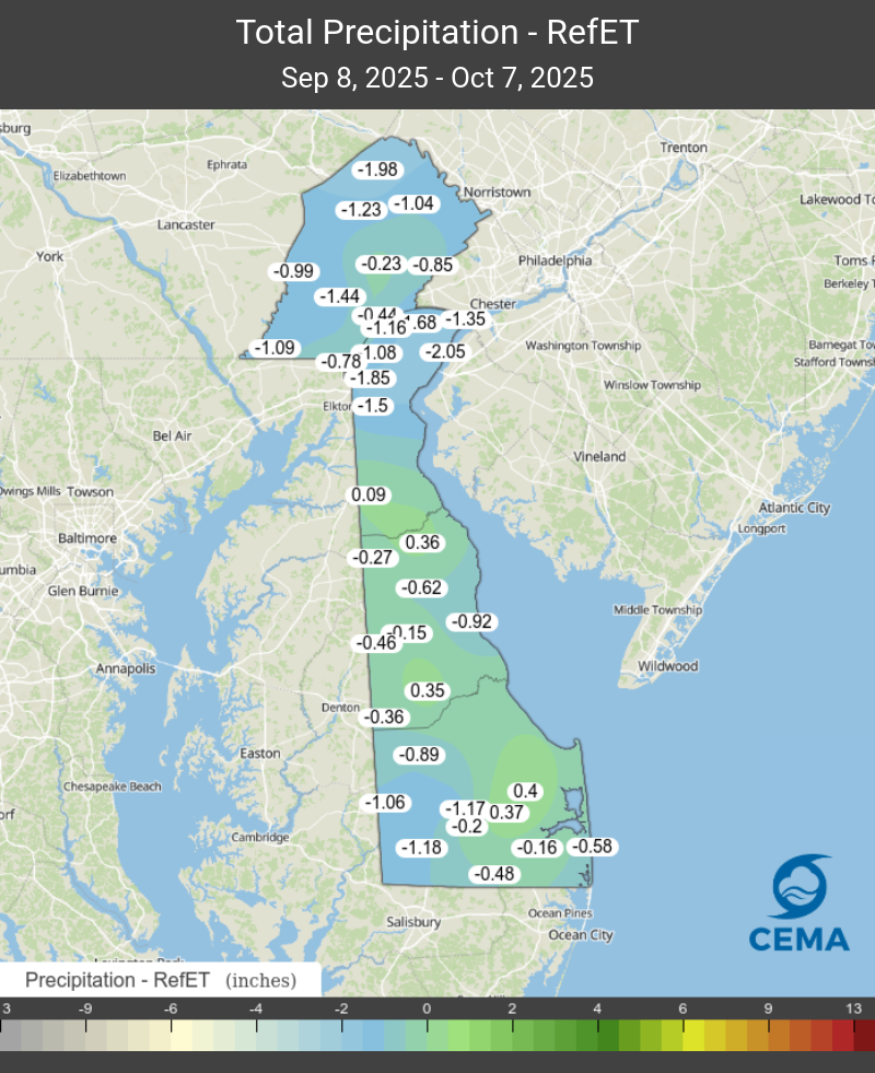 The statewide average reference evapotranspiration over the last 30 days was 3.04 inches, according to DEOS Network data. With statewide average precipitation at 2.32 inches over that same timeframe, the state has run a modest deficit (-0.72”) since September 8th. Figure 2 shows P-ET (precipitation minus reference evapotranspiration) over the last 30 days for the DEOS Network. P-ET was negative (deficit) throughout northern New Castle County, while eastern Sussex saw the greatest positive differences (surplus).