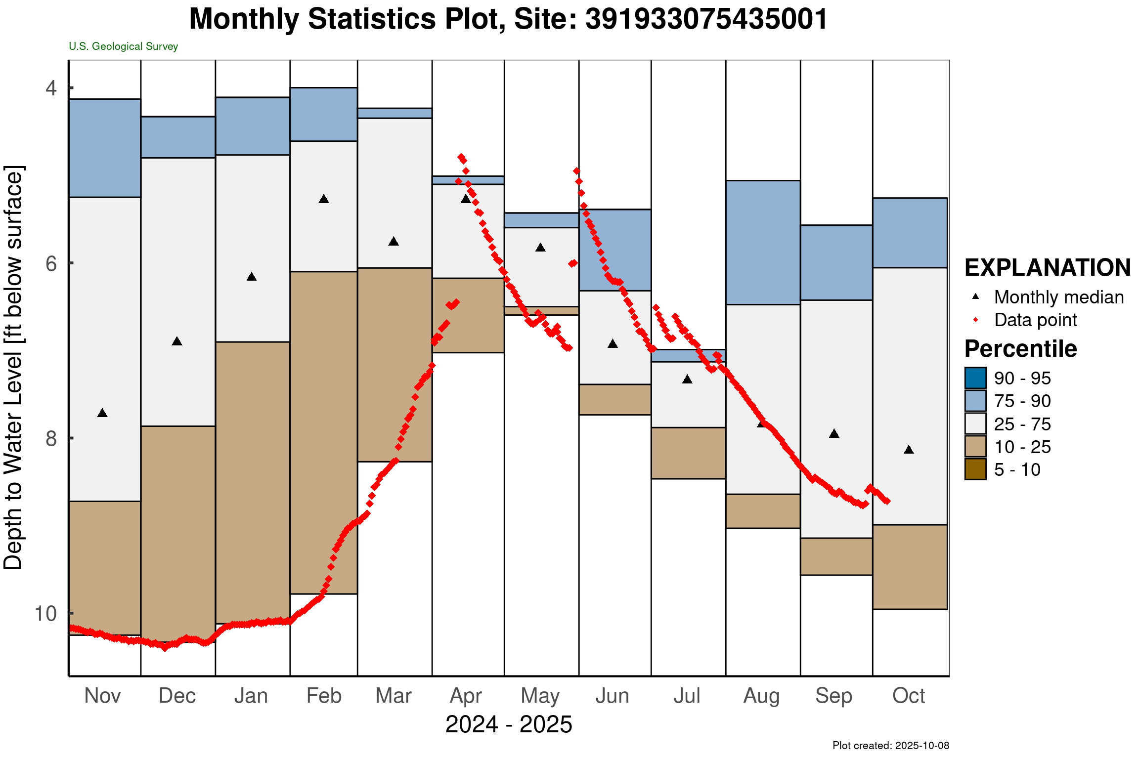 Elsewhere in the state, groundwater conditions vary. A well in southern New Castle County (Hb12-05) remains close to its average October level (Figure 4), while a well in southwestern Kent County (Mc51-01a) has been declining steadily since late April and is now below the 5th percentile, indicating much lower-than-normal conditions. In southeastern Sussex County, the well Pf24-02 has remained within the normal range since May, with a brief period of above-normal levels in early August.